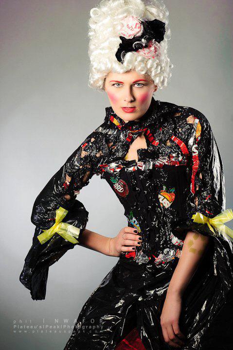 The corset and skirt are made from black trash bags, dorito bags and aluminum pop cans.