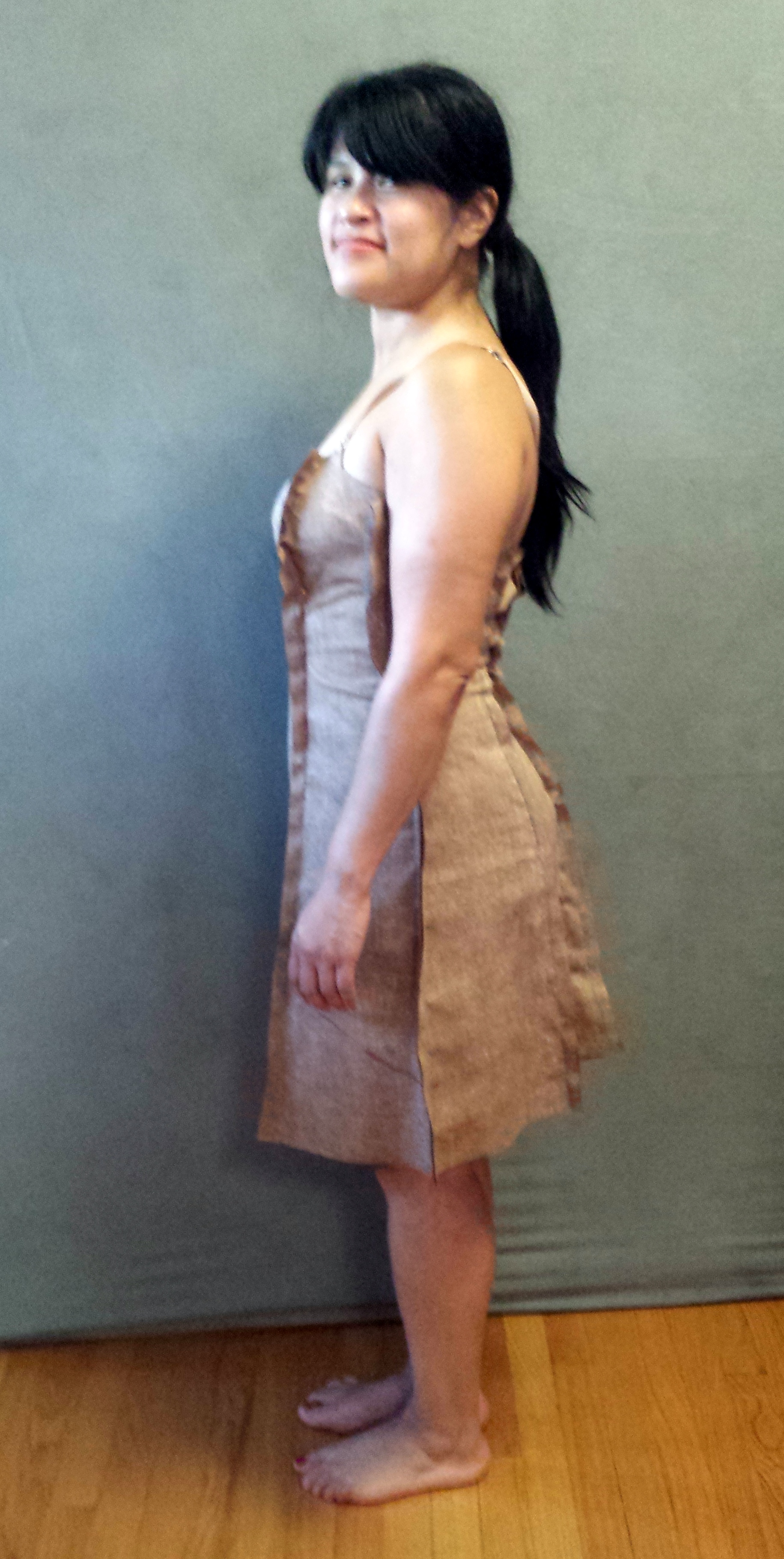 I started with a basic strapless a-line dress as my muslin and had her try it on so I can pin it and add my style line at the bottom of the dress.